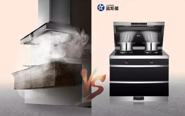 ▲传统油烟机vs沐鸣2集成灶侧吸下排